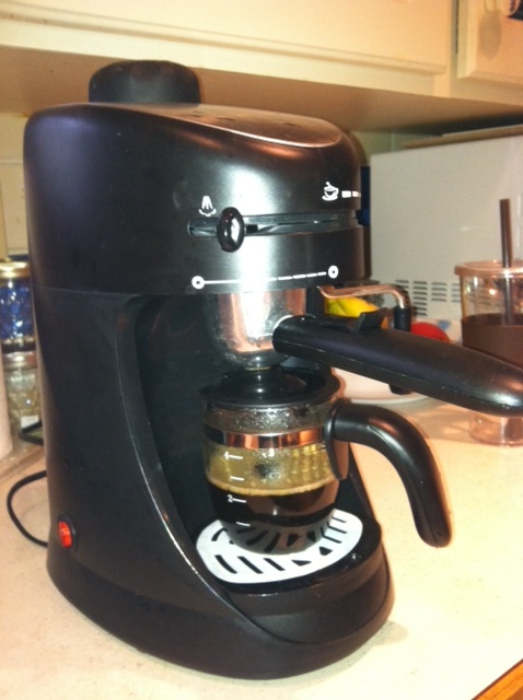 OK, previously, I figured out how not to burn my house down while making tea.  Now I’ve moved on to the potentially more dangerous espresso machine.  This is a great design, but it lacks an automatic shut-off switch, so it just keeps building up pressure.  Whoops.