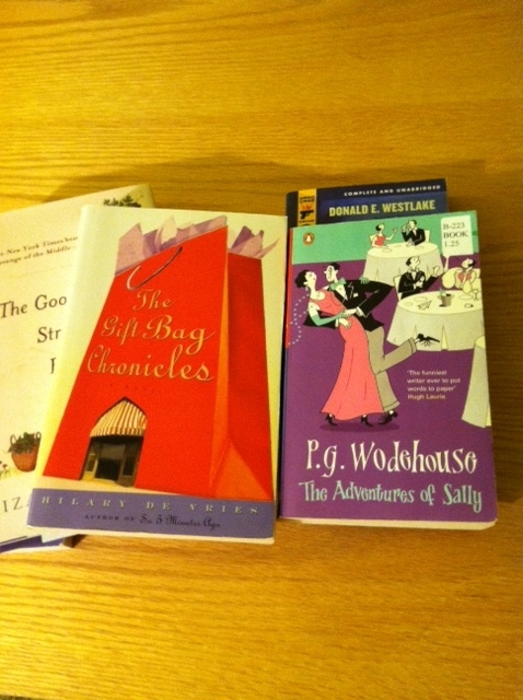 So one yard sale ($1 a bag) and one consignment shop later, I have a  nice pile of books from which to choose something much better suited for reading before sleeping and dreaming.  A Wodehouse, a Westlake, and a whole bunch of Chick Lit.   Sweet dreams!