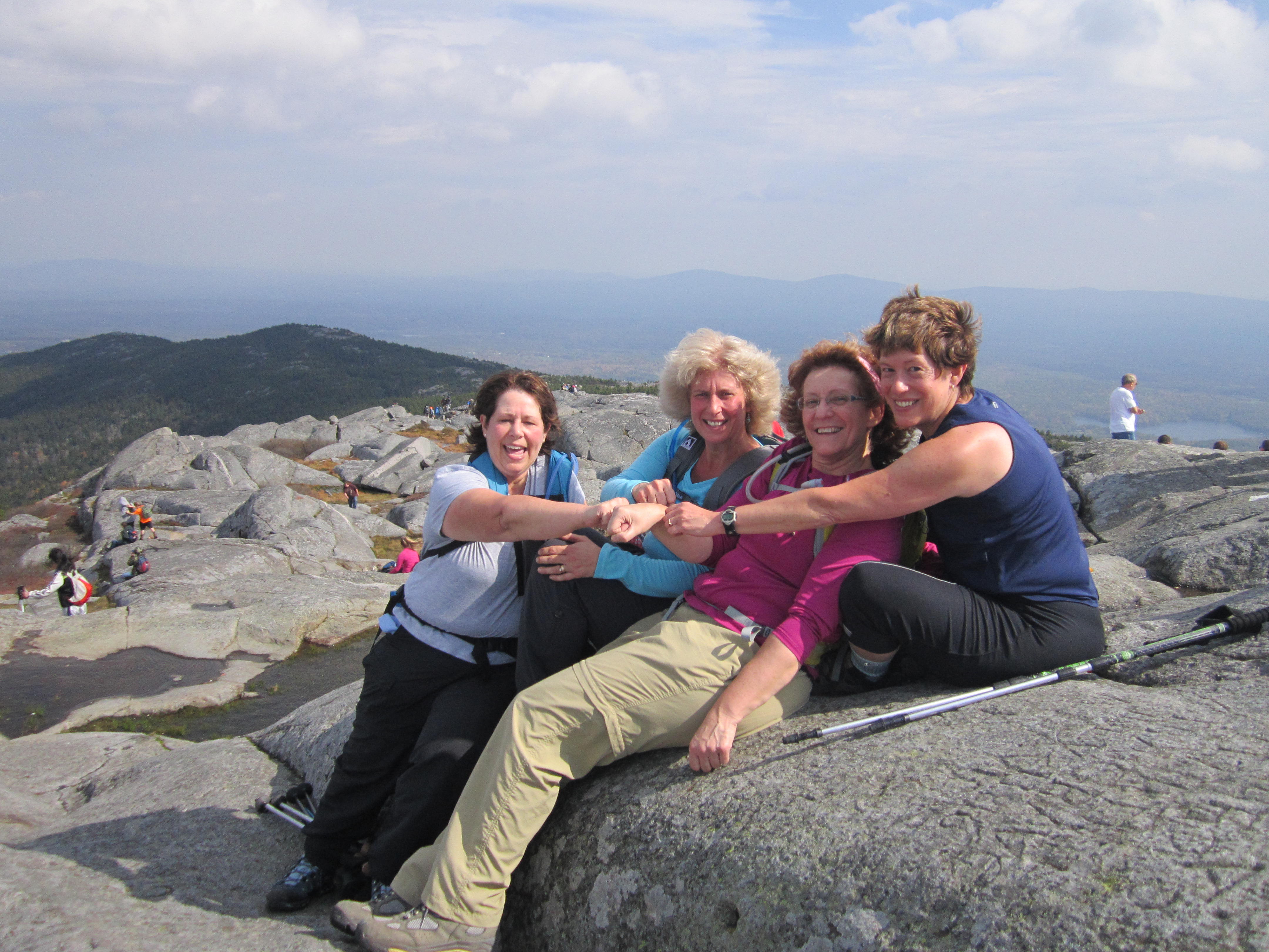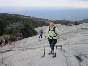 I learned a number of lessons on my hike with Michelle, Faith and Kathy up and down Mt. Monadnock, and this was just one of them: On rocky faces, if you don’t have rubber tips on your hiking poles (and more on why not, later), you can FLIP the poles, putting the rubber handles down for traction! I tell you, this was a game changer for me on the way down. It was also one factor in not repeating the face plant from my last fateful trip on this glorious hill.
